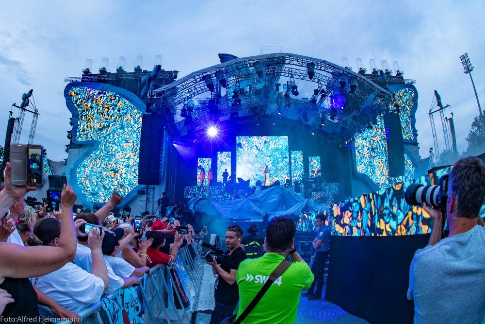 13._Heimspiel_Andrea_Berg__Freitag(1) Mechatronikarena Aspach, 20.7.2018 15000 Besucher waren zum 1. Konzert des 13. Andrea Berg Heimspiel in die Arena in der Fautenau gekommen. Durch die Hitze waren im Vorprogramm nicht soviele Fans wie sonst an der Bühne. Rebel Tell und Sunrise waren Künstler, die im Vorprogramm für die meiste Stimmung sorgten, aber es traten noch andere Künstler auf, u.a. eine Sängerin aus Kleinaspach. Gegen 21 Uhr dann der große Moment, als der Schmetterlingvorhang fiel und Andrea ihr 3 stündiges Konzert begann, sie strahlte mit einem lächeln den ganzen Abend, man merkte, sie freute sich, so wie auch ihre Fans. Mit einem großen Feuerwerk endete ein schöner Sommerabend. |