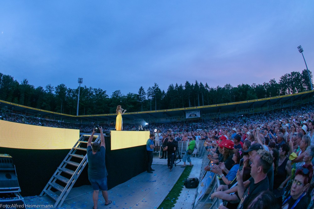 13._Heimspiel_Andrea_Berg__Freitag(1) Mechatronikarena Aspach, 20.7.2018 15000 Besucher waren zum 1. Konzert des 13. Andrea Berg Heimspiel in die Arena in der Fautenau gekommen. Durch die Hitze waren im Vorprogramm nicht soviele Fans wie sonst an der Bühne. Rebel Tell und Sunrise waren Künstler, die im Vorprogramm für die meiste Stimmung sorgten, aber es traten noch andere Künstler auf, u.a. eine Sängerin aus Kleinaspach. Gegen 21 Uhr dann der große Moment, als der Schmetterlingvorhang fiel und Andrea ihr 3 stündiges Konzert begann, sie strahlte mit einem lächeln den ganzen Abend, man merkte, sie freute sich, so wie auch ihre Fans. Mit einem großen Feuerwerk endete ein schöner Sommerabend. |