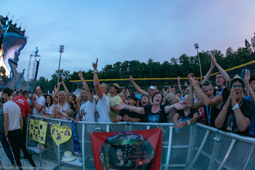 13._Heimspiel_Andrea_Berg__Freitag(1) Mechatronikarena Aspach, 20.7.2018 15000 Besucher waren zum 1. Konzert des 13. Andrea Berg Heimspiel in die Arena in der Fautenau gekommen. Durch die Hitze waren im Vorprogramm nicht soviele Fans wie sonst an der Bühne. Rebel Tell und Sunrise waren Künstler, die im Vorprogramm für die meiste Stimmung sorgten, aber es traten noch andere Künstler auf, u.a. eine Sängerin aus Kleinaspach. Gegen 21 Uhr dann der große Moment, als der Schmetterlingvorhang fiel und Andrea ihr 3 stündiges Konzert begann, sie strahlte mit einem lächeln den ganzen Abend, man merkte, sie freute sich, so wie auch ihre Fans. Mit einem großen Feuerwerk endete ein schöner Sommerabend. |
