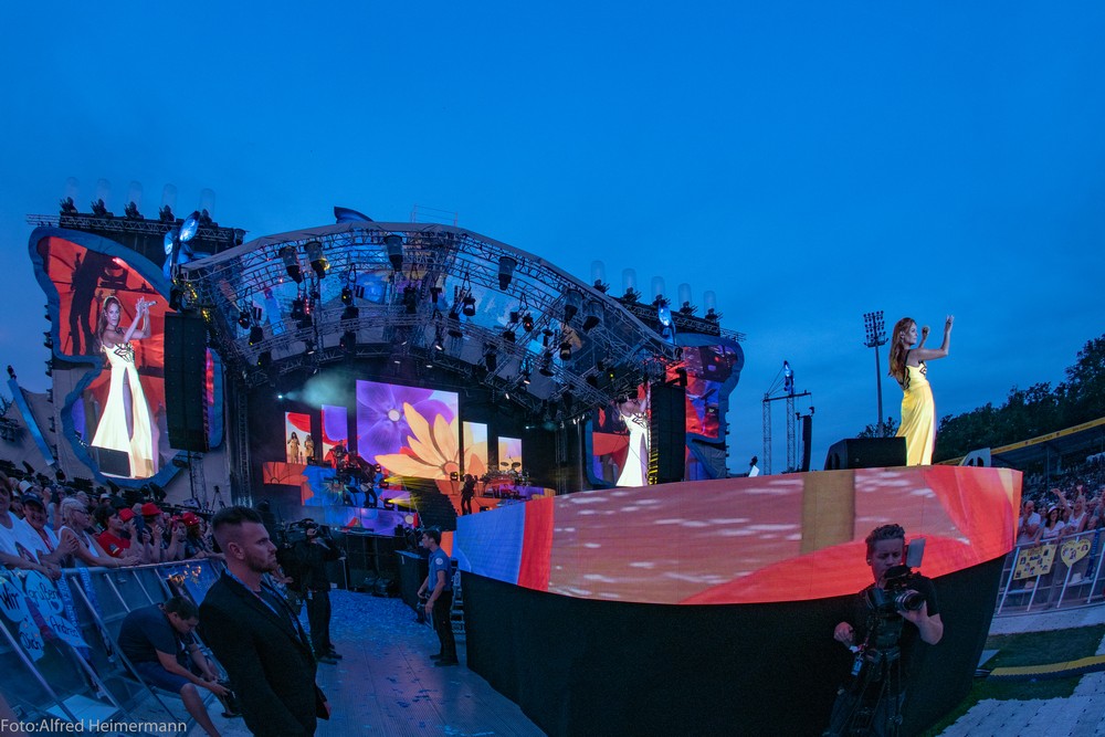 13._Heimspiel_Andrea_Berg__Freitag(1) Mechatronikarena Aspach, 20.7.2018 15000 Besucher waren zum 1. Konzert des 13. Andrea Berg Heimspiel in die Arena in der Fautenau gekommen. Durch die Hitze waren im Vorprogramm nicht soviele Fans wie sonst an der Bühne. Rebel Tell und Sunrise waren Künstler, die im Vorprogramm für die meiste Stimmung sorgten, aber es traten noch andere Künstler auf, u.a. eine Sängerin aus Kleinaspach. Gegen 21 Uhr dann der große Moment, als der Schmetterlingvorhang fiel und Andrea ihr 3 stündiges Konzert begann, sie strahlte mit einem lächeln den ganzen Abend, man merkte, sie freute sich, so wie auch ihre Fans. Mit einem großen Feuerwerk endete ein schöner Sommerabend. |
