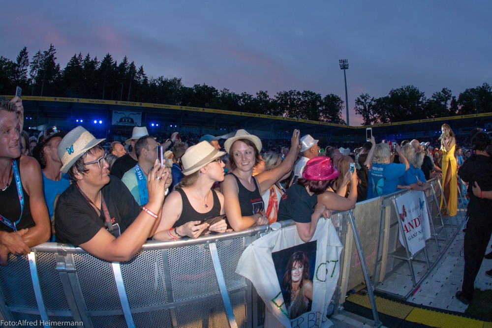 13._Heimspiel_Andrea_Berg__Freitag(1) Mechatronikarena Aspach, 20.7.2018 15000 Besucher waren zum 1. Konzert des 13. Andrea Berg Heimspiel in die Arena in der Fautenau gekommen. Durch die Hitze waren im Vorprogramm nicht soviele Fans wie sonst an der Bühne. Rebel Tell und Sunrise waren Künstler, die im Vorprogramm für die meiste Stimmung sorgten, aber es traten noch andere Künstler auf, u.a. eine Sängerin aus Kleinaspach. Gegen 21 Uhr dann der große Moment, als der Schmetterlingvorhang fiel und Andrea ihr 3 stündiges Konzert begann, sie strahlte mit einem lächeln den ganzen Abend, man merkte, sie freute sich, so wie auch ihre Fans. Mit einem großen Feuerwerk endete ein schöner Sommerabend. |