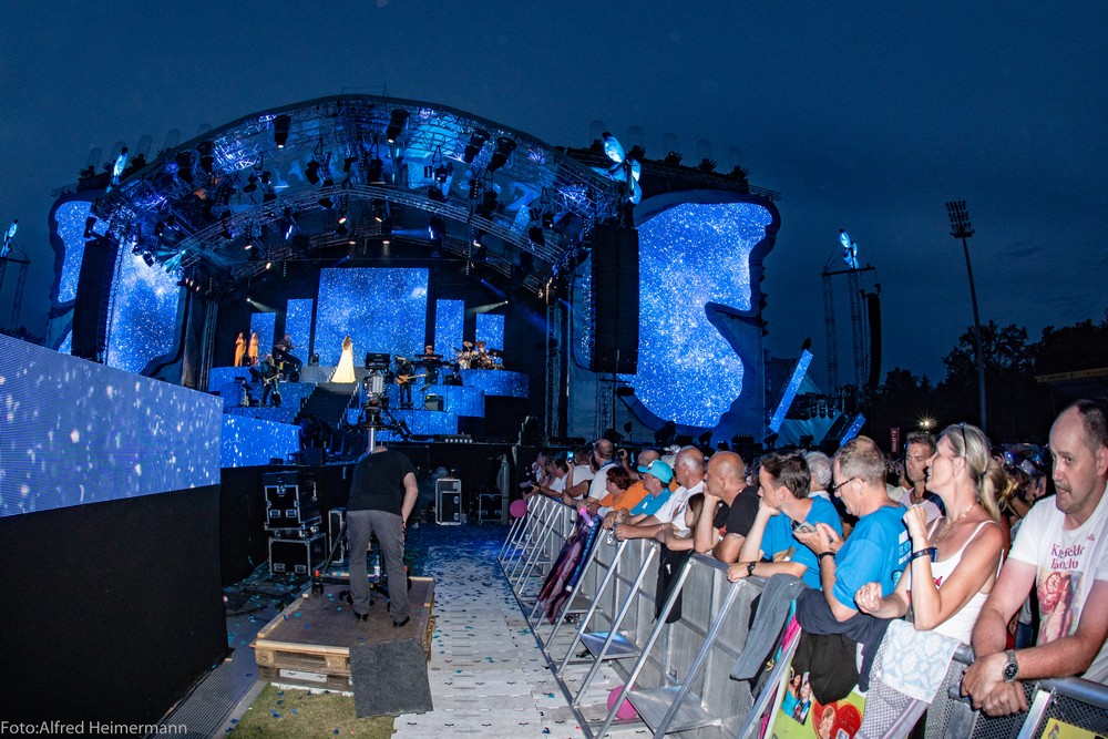 13._Heimspiel_Andrea_Berg__Freitag(1) Mechatronikarena Aspach, 20.7.2018 15000 Besucher waren zum 1. Konzert des 13. Andrea Berg Heimspiel in die Arena in der Fautenau gekommen. Durch die Hitze waren im Vorprogramm nicht soviele Fans wie sonst an der Bühne. Rebel Tell und Sunrise waren Künstler, die im Vorprogramm für die meiste Stimmung sorgten, aber es traten noch andere Künstler auf, u.a. eine Sängerin aus Kleinaspach. Gegen 21 Uhr dann der große Moment, als der Schmetterlingvorhang fiel und Andrea ihr 3 stündiges Konzert begann, sie strahlte mit einem lächeln den ganzen Abend, man merkte, sie freute sich, so wie auch ihre Fans. Mit einem großen Feuerwerk endete ein schöner Sommerabend. |