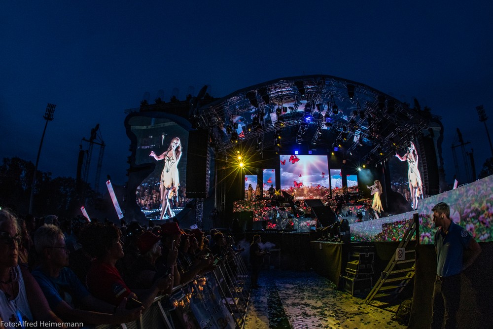 13._Heimspiel_Andrea_Berg__Freitag(1) Mechatronikarena Aspach, 20.7.2018 15000 Besucher waren zum 1. Konzert des 13. Andrea Berg Heimspiel in die Arena in der Fautenau gekommen. Durch die Hitze waren im Vorprogramm nicht soviele Fans wie sonst an der Bühne. Rebel Tell und Sunrise waren Künstler, die im Vorprogramm für die meiste Stimmung sorgten, aber es traten noch andere Künstler auf, u.a. eine Sängerin aus Kleinaspach. Gegen 21 Uhr dann der große Moment, als der Schmetterlingvorhang fiel und Andrea ihr 3 stündiges Konzert begann, sie strahlte mit einem lächeln den ganzen Abend, man merkte, sie freute sich, so wie auch ihre Fans. Mit einem großen Feuerwerk endete ein schöner Sommerabend. |