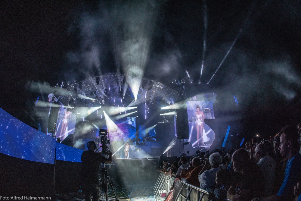 13._Heimspiel_Andrea_Berg__Freitag(1) Mechatronikarena Aspach, 20.7.2018 15000 Besucher waren zum 1. Konzert des 13. Andrea Berg Heimspiel in die Arena in der Fautenau gekommen. Durch die Hitze waren im Vorprogramm nicht soviele Fans wie sonst an der Bühne. Rebel Tell und Sunrise waren Künstler, die im Vorprogramm für die meiste Stimmung sorgten, aber es traten noch andere Künstler auf, u.a. eine Sängerin aus Kleinaspach. Gegen 21 Uhr dann der große Moment, als der Schmetterlingvorhang fiel und Andrea ihr 3 stündiges Konzert begann, sie strahlte mit einem lächeln den ganzen Abend, man merkte, sie freute sich, so wie auch ihre Fans. Mit einem großen Feuerwerk endete ein schöner Sommerabend. |