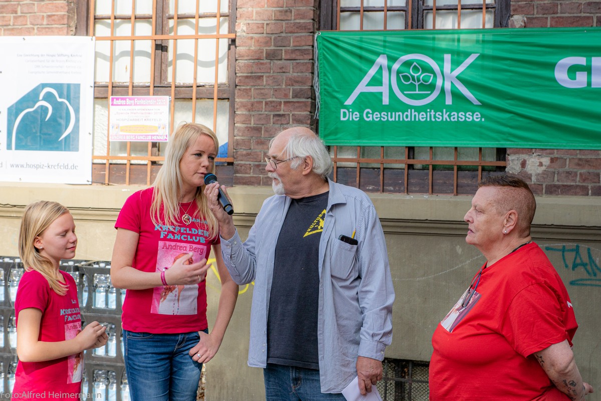 9. Hospizlauf in Krefeld Hospiz am Blumenplatz in Krefeld Rund 1000 Laufer und Läuferinnen waren an verschiedenen Stelle in Krefeld auf verschiedenen langen Strecken gestartet. Ziel war das Hospiz am Blumenplatz. Viele Gäste (Sterbenskranke) vom hospiz warteten am Hospiz auf die Sportler, die mit dem Lauf und dem Startgeld von 10 Euro die tolle Arbeit der Hospizmitarbeiter/innen unterstützen. Das Wetter war optimal. Eine bunte Anzahl von Mitgliedern aus verschiedenen Andrea berg Fanclubs waren aus ´nah und fern angereist, um die ehrenamtlichen Hospizhelfer bei der Arbeit zu unterstützen, ob beim Auf-und Abbau, oder bei der Ausgabe von Obst, Getränken und Grillwürstchen. Toll das mein Aufruf an die Fans auch Kuchen zu backen und mitzubringen, befolgt wurde und die 16 oder 17 Kuchen nur von den Andrea Berg Fans aus den Fanclubs waren nicht zuviel, denn zum Ende war fast alles aufgegessen. Beliebt wie seit einigen Jahren, sind die Würstchen von der Metzgerei Hielscher, die der FC Hennef mitbringt. Der Fanclub Hennef präsentierte aber auch erstmals "live" den 12. Andrea Berg Fankalender 2020, der ja zu gunsten der Hospizarbeit Krefeld erstelllt wird. Der Hospizgarten muss erneuert werden und ein Teil der Kalenderspendengeldern der letzten Jahre wird für den Garten und ein neues Dach dort verwendet. Im nächsten Jahr wird groß gefeiert, denn dann kommen die Spendenläufer zum 10. Hospizlauf. |
