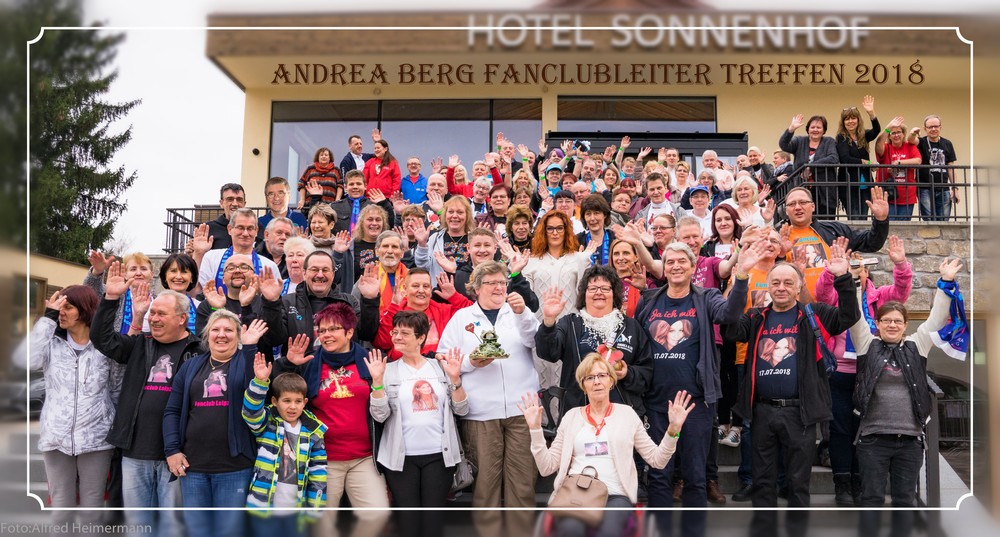 Andrea Berg Fanclubleiter Treffen 2018 Sonnenhof, Aspach Andrea Berg hatte zum 6. Fanclubleiter Treffen in den Sonnenhof eingeladen. Viele Clubs folgten der Einladung und verbrachten 2 wundervolle Tage bei Andrea im Sonnenhof. Am Sonntag stand dann Andrea und ihr Uli den Leitern für Gespräche, Fragen, Autogramme und Fotos zur Verfügung. Hier nun die Bilder vom Treffen. |