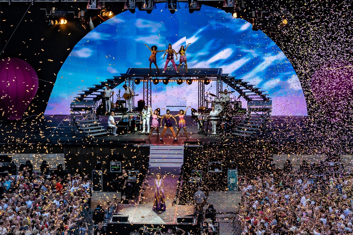 Immer ein besonderes Konzert in Berlin auf der Waldbühne von Andrea Berg. Fans aus ganz Deutschland und Österreich waren nach Berlin gepilgert um mit den 22000 Besuchern eine große Party bei bestem Sommerwetter zu feiern und alle waren begeistert. Zum Abschluss gab es noch ein Feuerwerk, was die Waldbühne erhellen ließ.
