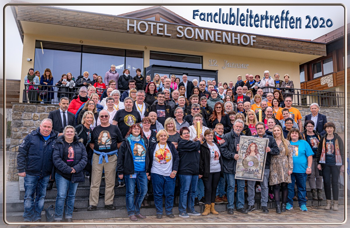 100 Fanclubleiter mit Stellvertretern waren der Einladung von Andrea und Uli in den Sonnenhof gefolgt und verfolgten Samstag im TV das fest der Feste, wo Andrea zur besten Sängerin 2020 , mit dem erfolgreichsten Album des Jahres ausgezeichnet wurde und noch eine Platin Auszeichnung für das AlbumMosaik bekam. Sonntag war dann Andrea gegen Mittag wieder aus Berlin zurück und verweilte bei ihren Fanclubleitern in der Dorfdiele, zuvor das traditionelle Gruppenfoto vor dem Hotel. Nachdem gemeinsamen Mittagesen Fototime mit Andrea und gleichzeitigem signieren von Fotos, Shirts, Albums. Gegen 16 Uhr endete das Treffen.