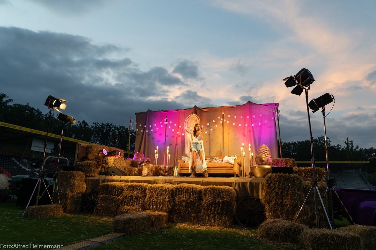 Openair Andrea Berg Aspach Das besondere Heimspiel, 17. Juli Wieder durften 2000 Fans Andrea auf der Bühne im Stadion der "Wir machen Druck" Arena bei sommerlichen Temperaturen feiern und für zwei Stunden den Alltag vergessen und trotzdem waren die Gedanken bei den Opfern der Flutkatastrophe, auch bei Andrea. |