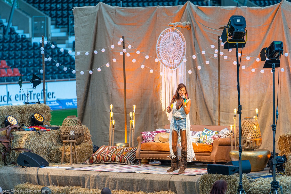Openair Andrea Berg Aspach Das besondere Heimspiel, Konzert 9. Juli 2000 Besucher durften zum ersten von vier Openairkonzerten von Andrea Berg in die "Wir machen Druck Arena" und erlebten eine tolle Show . Andrea freute sich wie dolle wieder vor Publikum auf der Bühne zu stehen und forderte ihre Fans auf: steh auf und tanz. 90 Minuten durfte sie ihr Publikum mit ihren Liedern begeistern, ein Lichtblick in Pandemiezeiten. Die vier Konzerte sind ein Modellprojekt der Landesregierung von BW. |